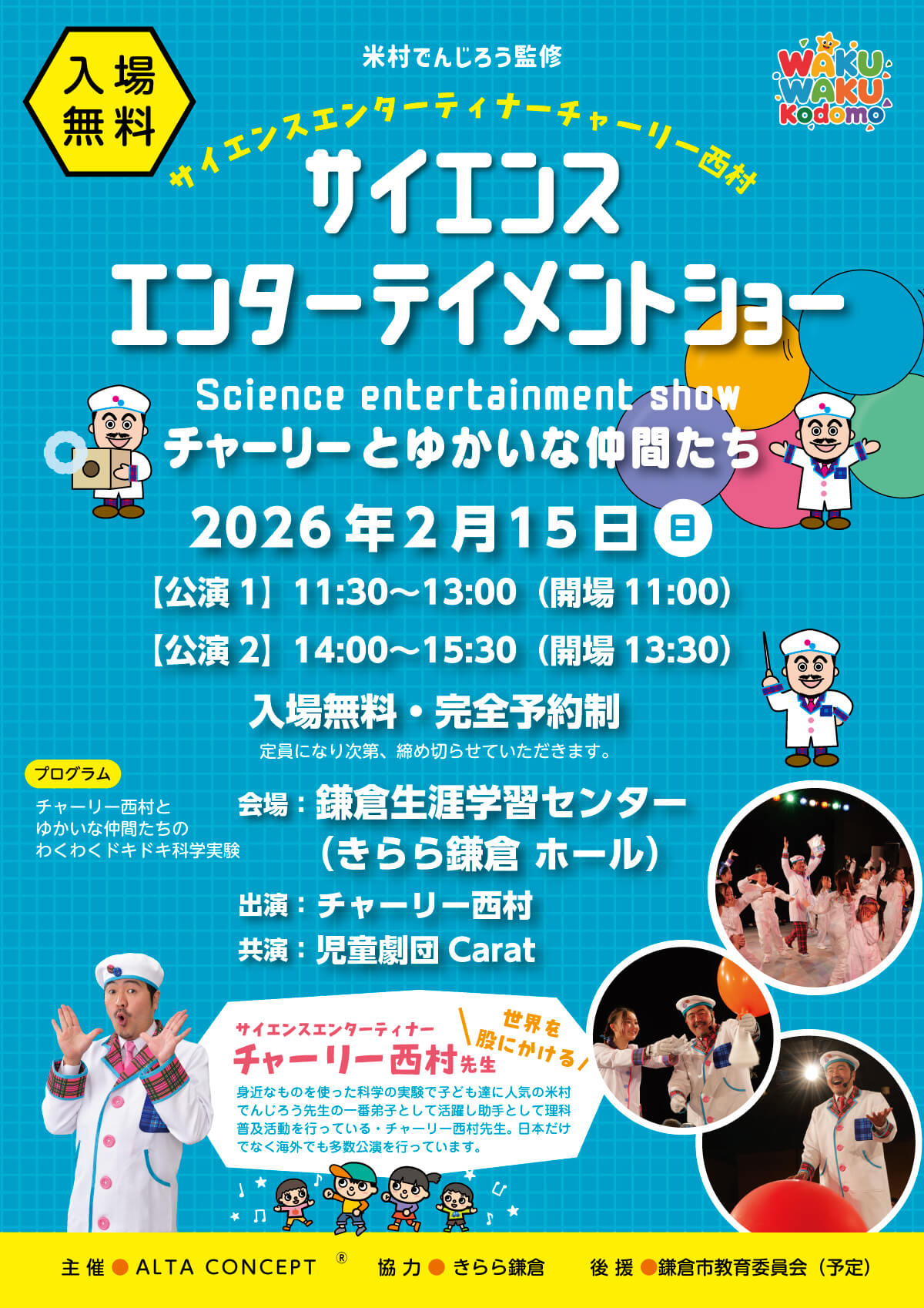 公演案内 2025.12.04 2025.12.17 【公演予定】2026.2/15 サイエンスエンターテイメントショー |きらら鎌倉ホール|チャーリーとゆかいななかまたち 【公演予定】 米村でんじろう監修 サイエンス エンターテイメントショー チャーリーとゆかいな仲間たち 2026年2月15日(日) きらら鎌倉生涯学習センター(きらら鎌倉)ホール 会場:きらら鎌倉生涯学習センター(きらら鎌倉)ホール(神奈川県鎌倉市) 【過去例】 2025年5月17日(土) 会場:鎌倉芸術館 出演:carat DANCE SCHOOL 協力:鎌倉芸術館 後援:鎌倉市教育委員会 【共演】2025.12/21 あらしのよるに朗読公演|玉川髙島屋S.C.アレーナホール 前の記事 【公演予定】2026.2/23 あらしのよるに|明治学院大学 白金キャンパス 次の記事
