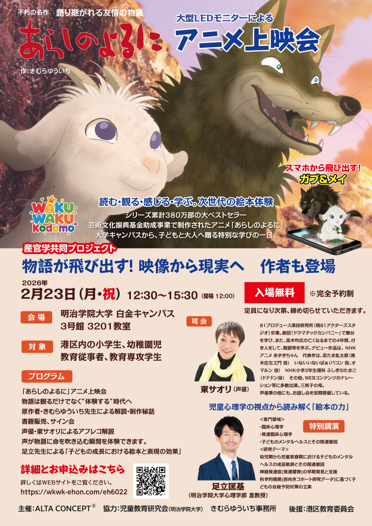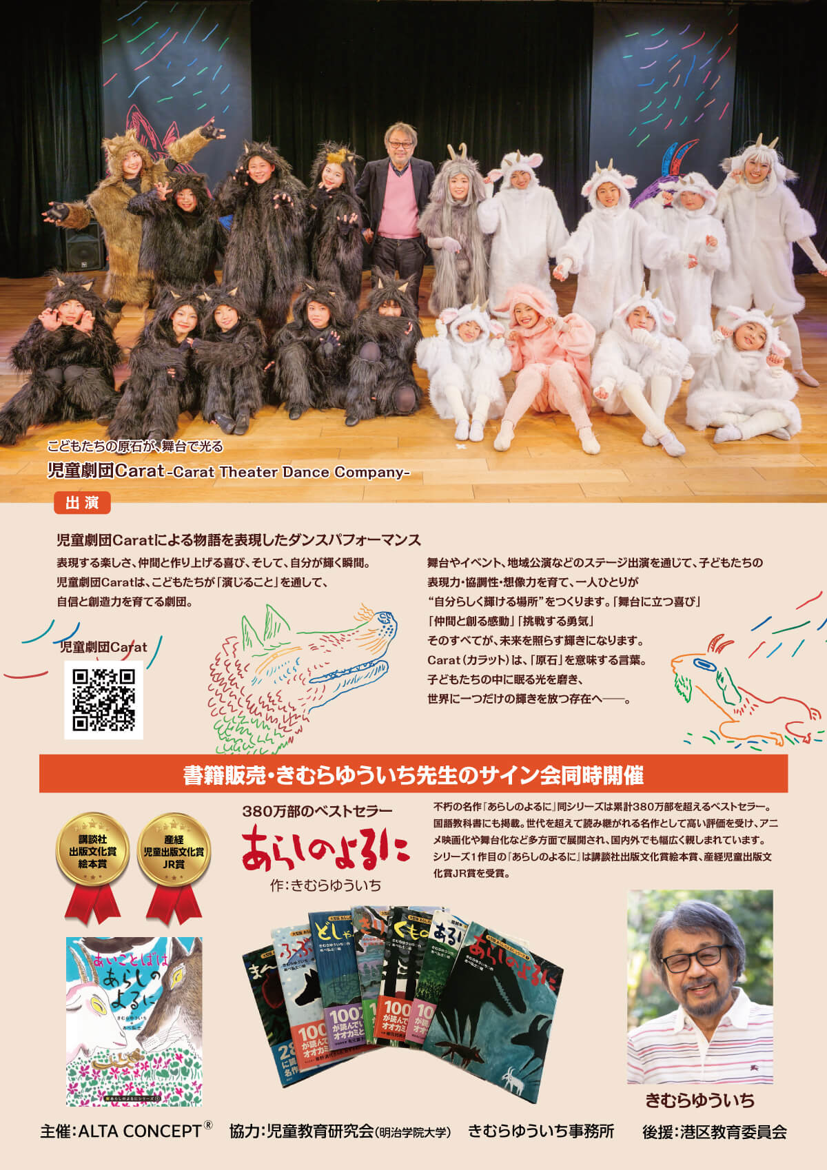 予定 2025.12.04 2026.01.29 2026.2/23 あらしのよるに|明治学院大学 白金キャンパス 【公演予定】 あらしのよるに 2026年2月23日(月・祝) 明治学院大学 白金キャンパス 詳しいイベント情報については、公式サイトをご覧ください。 イベント公式サイト 会場:明治学院大学 白金キャンパス(東京港区) 2026.2/15 サイエンスエンターテイメントショー |きらら鎌倉ホール|チャーリーとゆかいななかまたち 前の記事 2026.5/3 神奈川県立音楽堂(木のホール) 次の記事