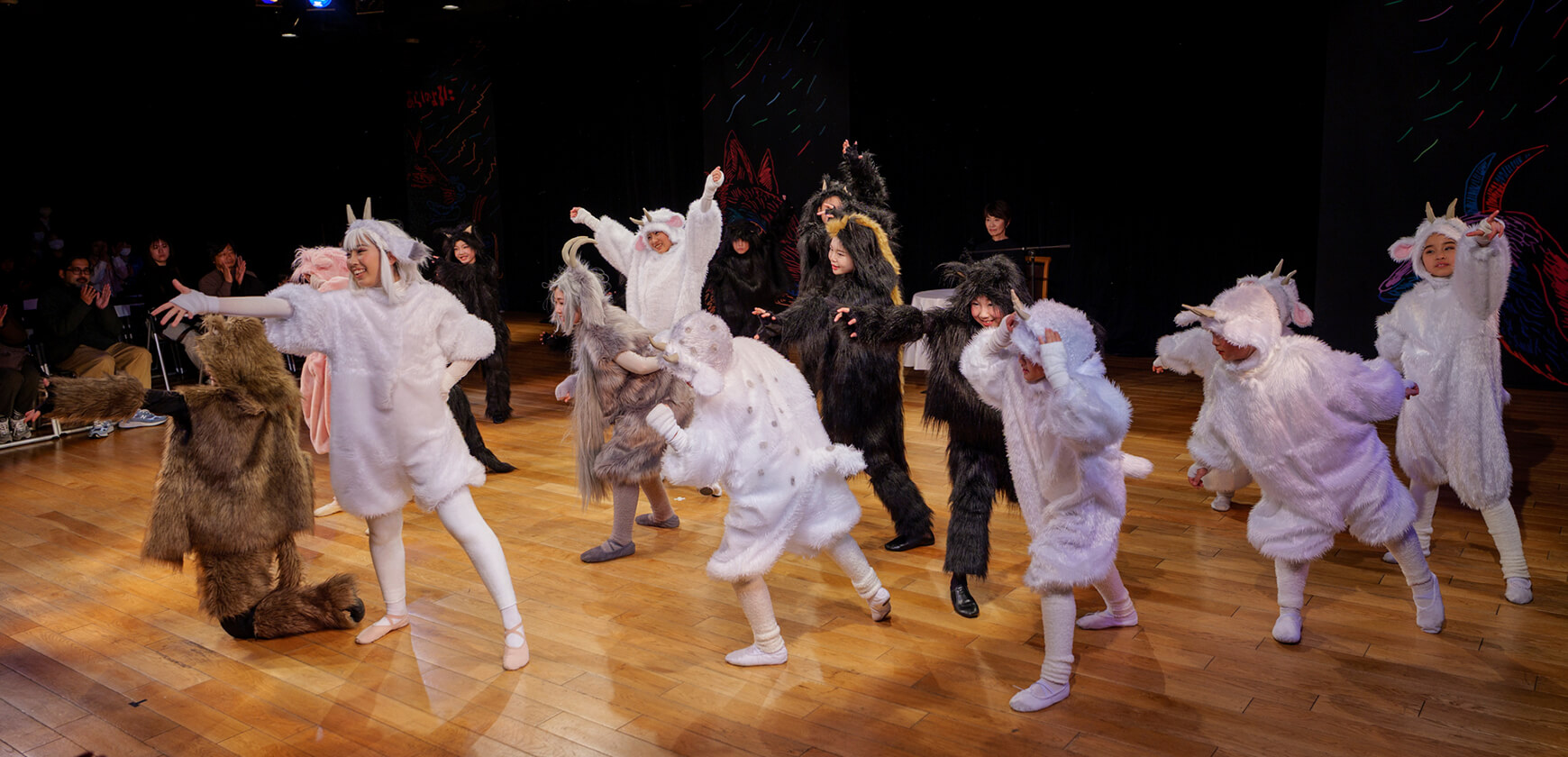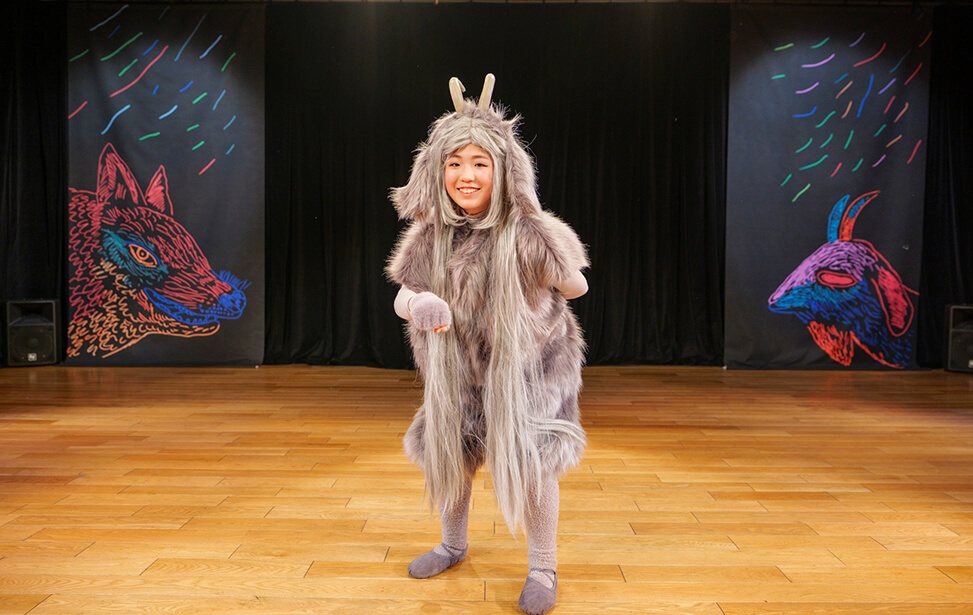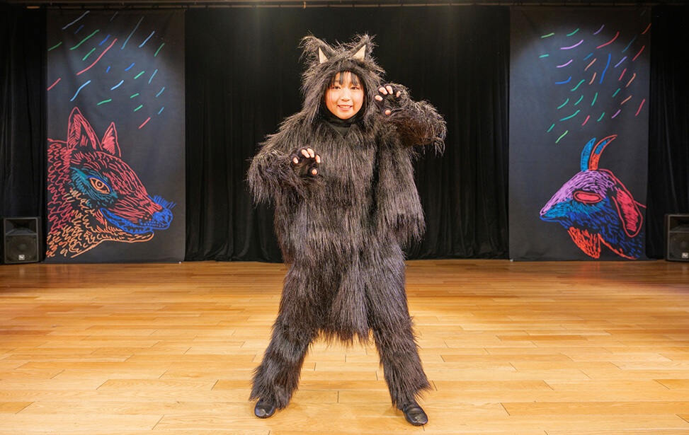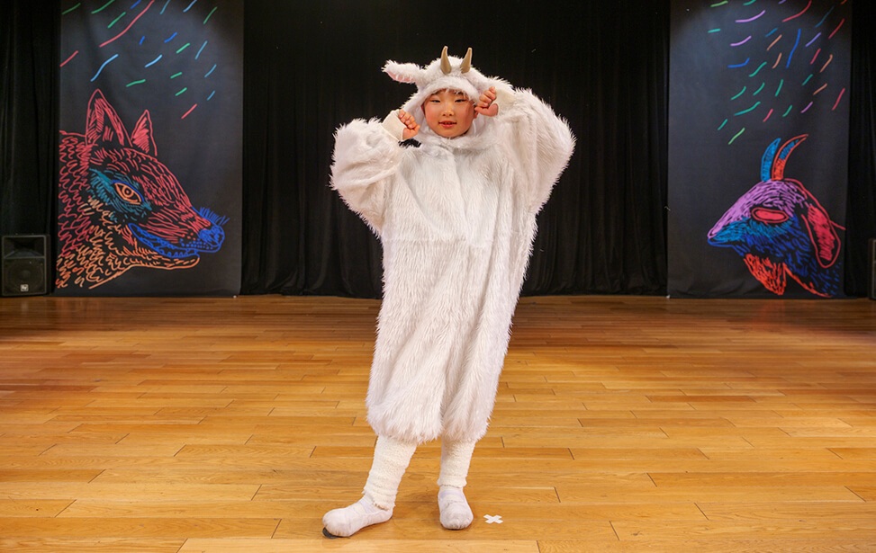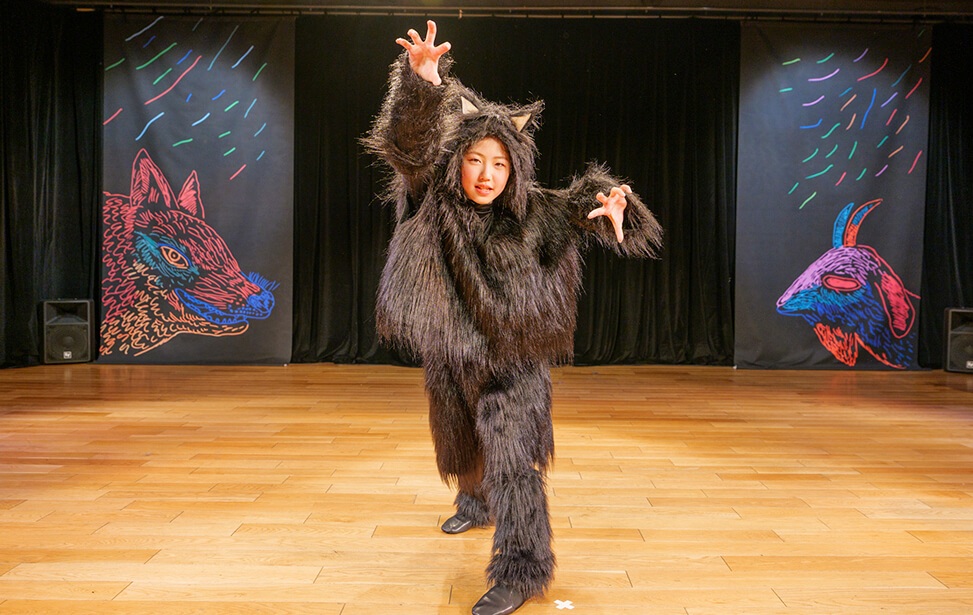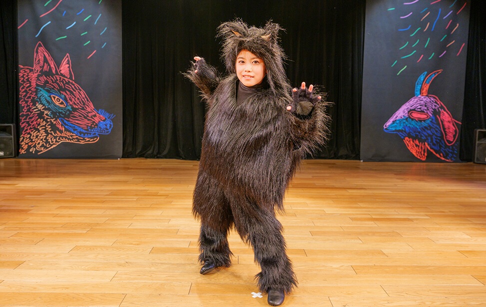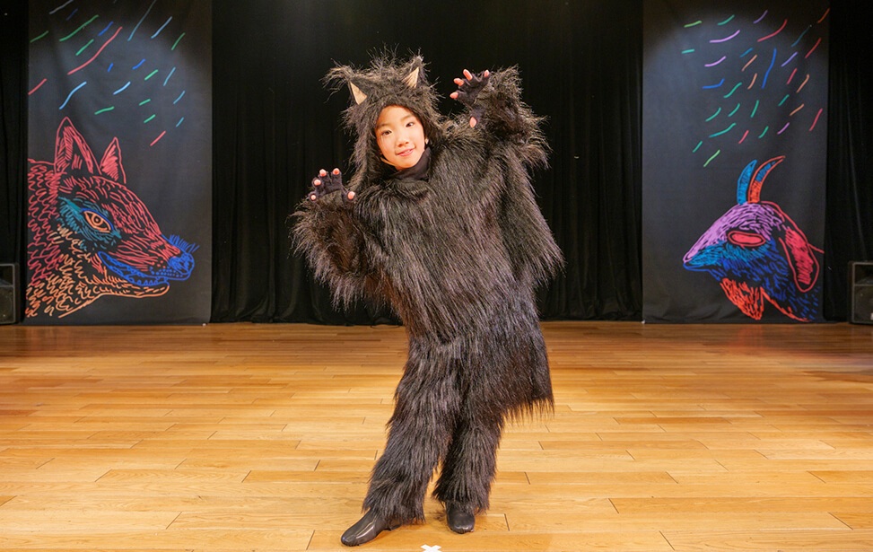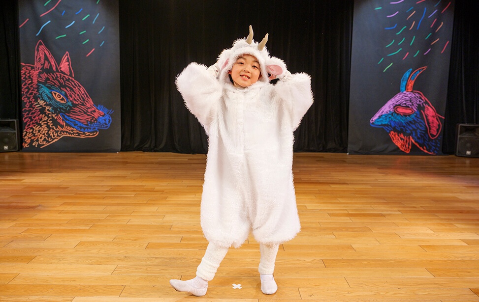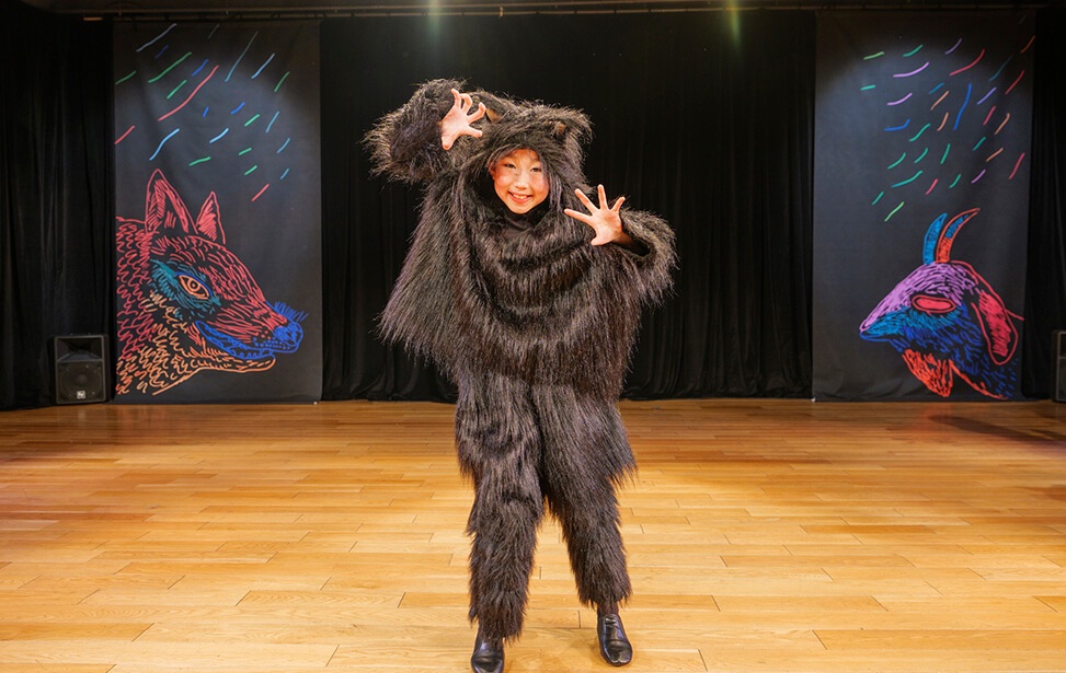 本公演では、名作絵本『あらしのよるに』の世界を、朗読とともに児童劇団Caratの子どもたちがダンスという身体表現で描き出しました。言葉だけでなく、動き・表情・リズムを通して物語の感情を伝える児童劇団Caratならではのステージは、会場を静かな感動で包み込みました。