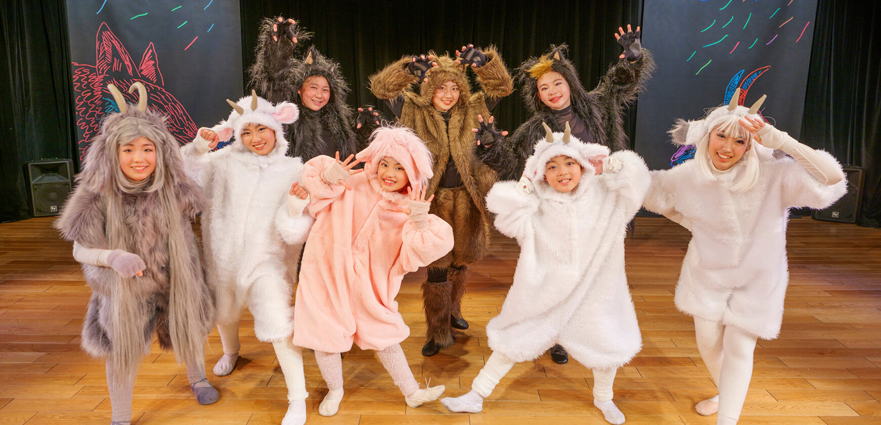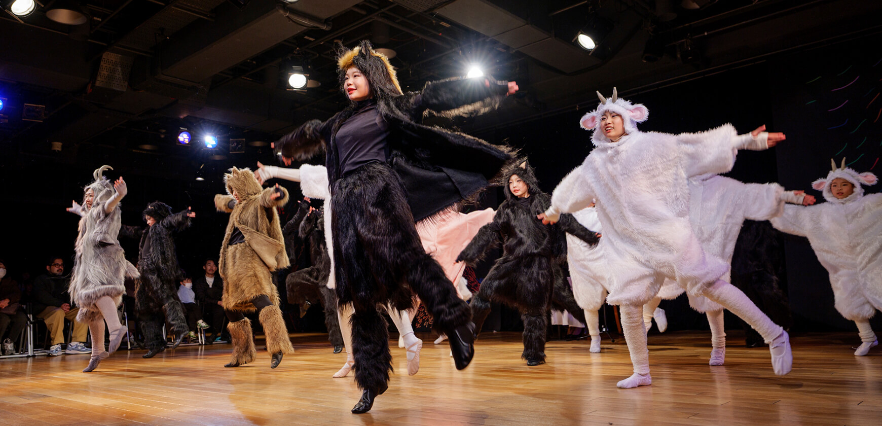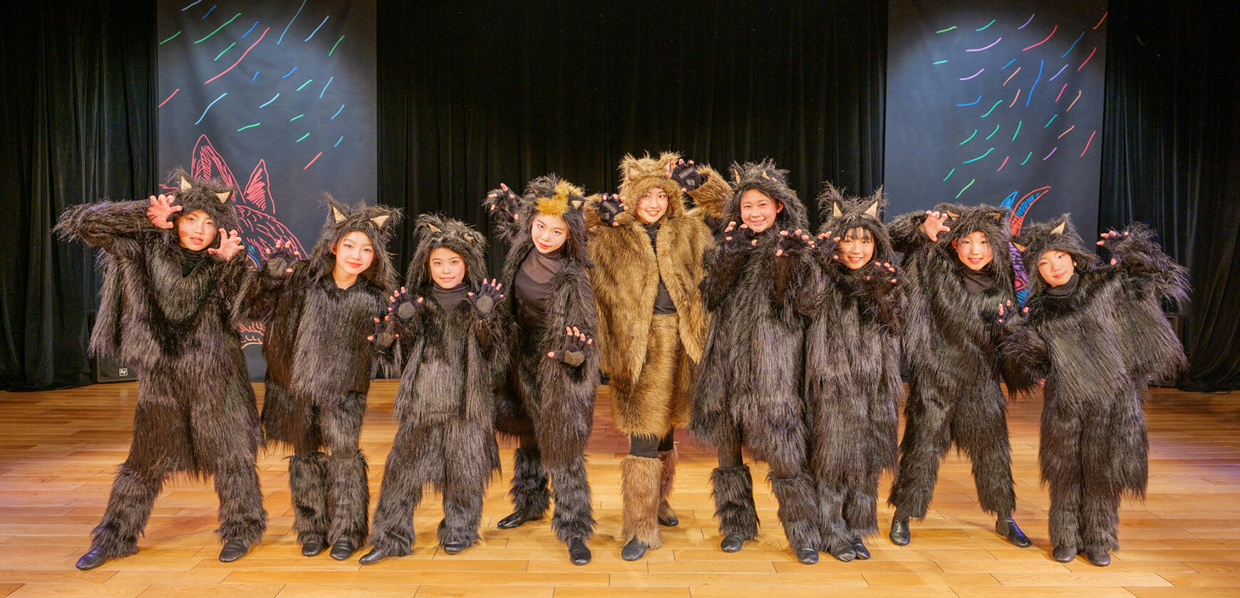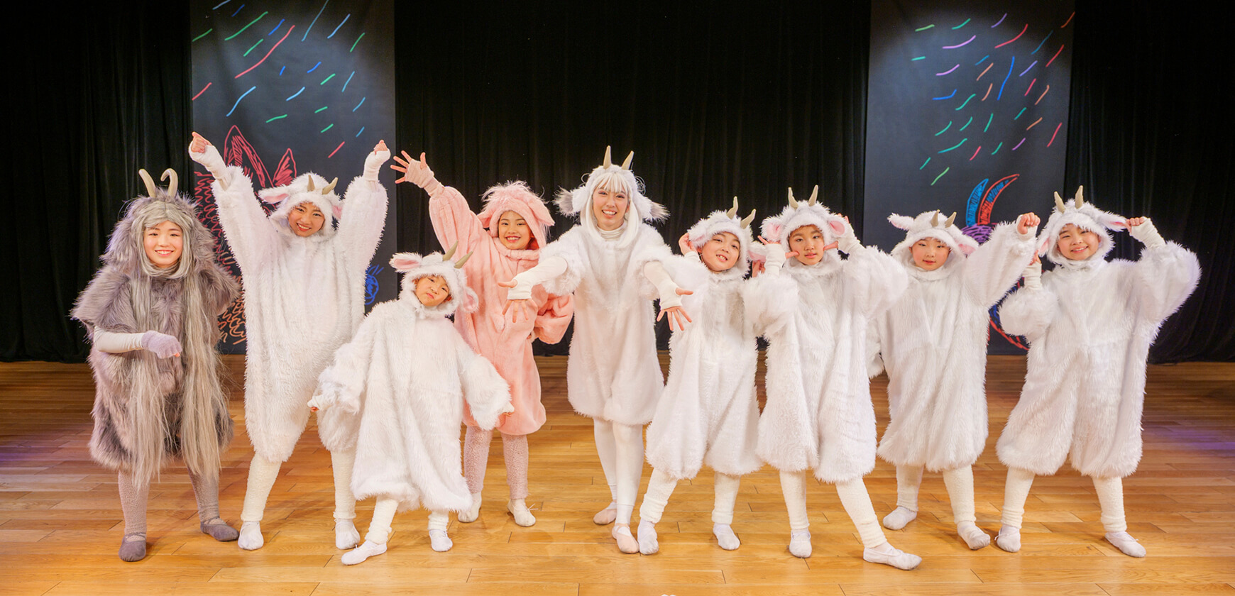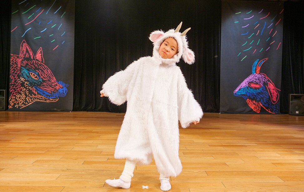 本公演では、名作絵本『あらしのよるに』の世界を、朗読とともに児童劇団Caratの子どもたちがダンスという身体表現で描き出しました。言葉だけでなく、動き・表情・リズムを通して物語の感情を伝える児童劇団Caratならではのステージは、会場を静かな感動で包み込みました。